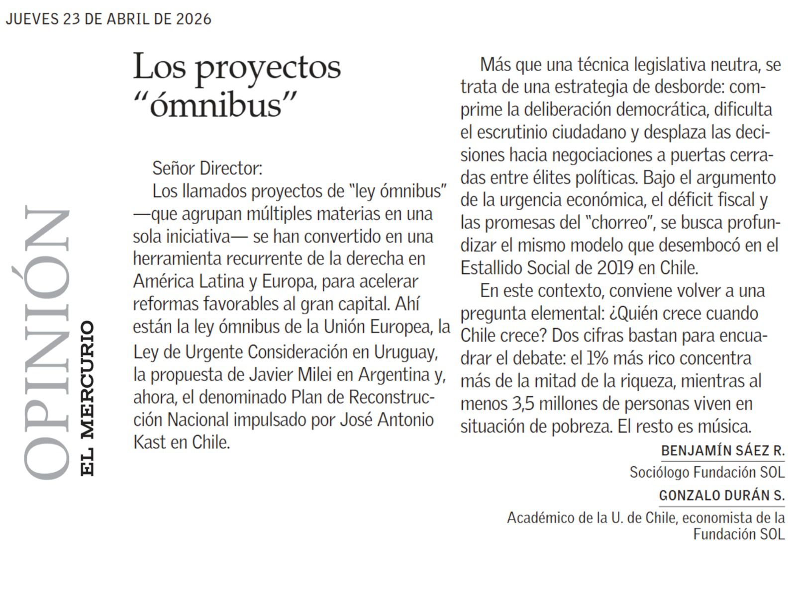 Los llamados proyectos de “ley ómnibus” - que agrupan múltiples materias en una sola iniciativa - se han convertido en una herramienta recurrente de la derecha en América Latina y Europa para acelerar reformas favorables al gran capital. Ahí están la Ley Ómnibus de la Unión Europea, la Ley de Urgente Consideración en Uruguay, la propuesta de Javier Millei en Argentina y, ahora, el denominado Plan de Reconstrucción Nacional impulsado por José Antonio Kast en Chile. Más que una técnica legislativa neutra, se trata de una estrategia de desborde: comprime la deliberación democrática, dificulta el escrutinio ciudadano y desplaza las decisiones hacia negociaciones a puertas cerradas entre élites políticas. Bajo el argumento de la urgencia económica, el déficit fiscal y las promesas del “chorreo”, se busca profundizar el mismo modelo que desembocó en el Estallido social de 2019 en Chile. En este contexto, conviene volver a una pregunta elemental: ¿quién crece cuando Chile crece? Dos cifras bastan para encuadrar el debate: el 1% más rico concentra más de la mitad de la riqueza, mientras al menos 3,5 millones de personas viven en situación de pobreza. El resto es música.